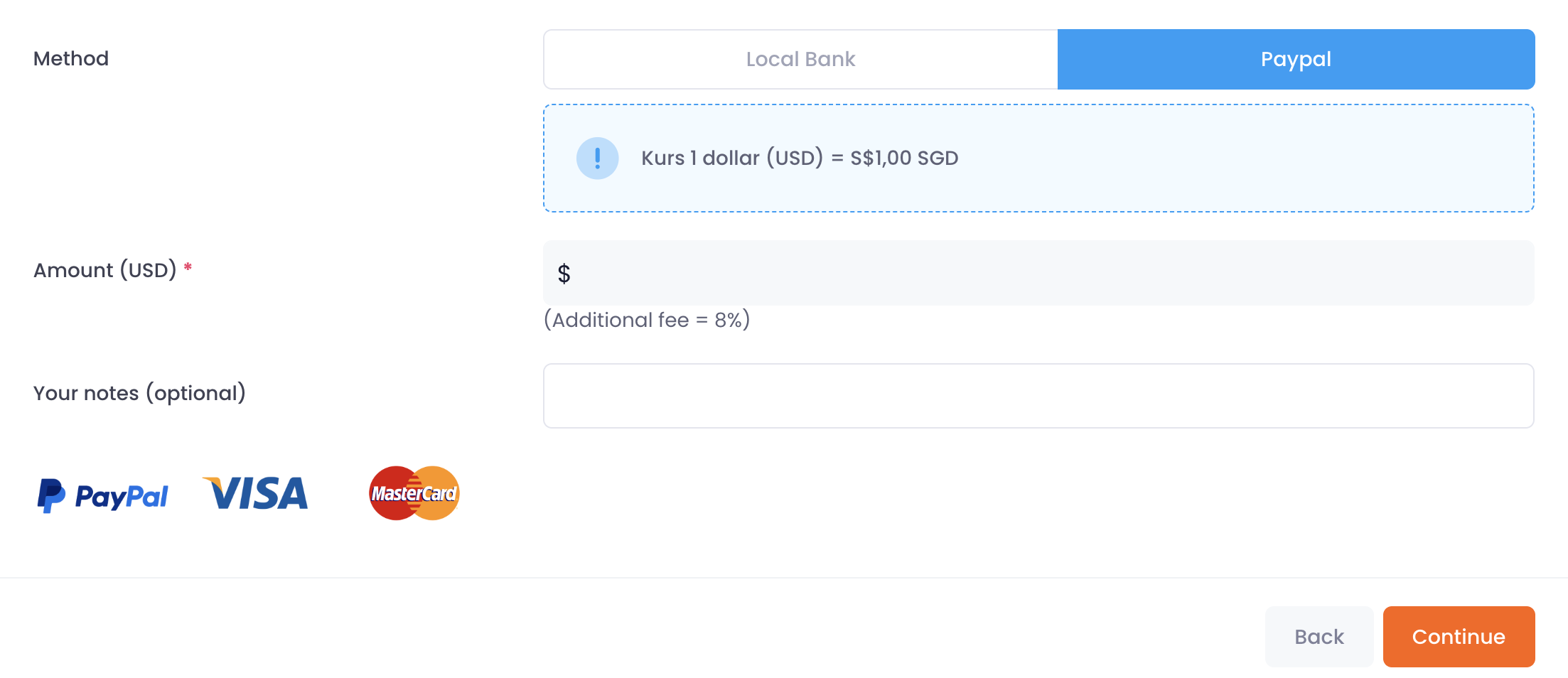 seedbacklink also supports payments through PayPal. You can pay using your PayPal balance or international debit/credit cards such as Visa and Mastercard linked to your PayPal account. After selecting PayPal as your payment method, enter the payment amount in SGD and proceed to the secure PayPal checkout page to complete the transaction.